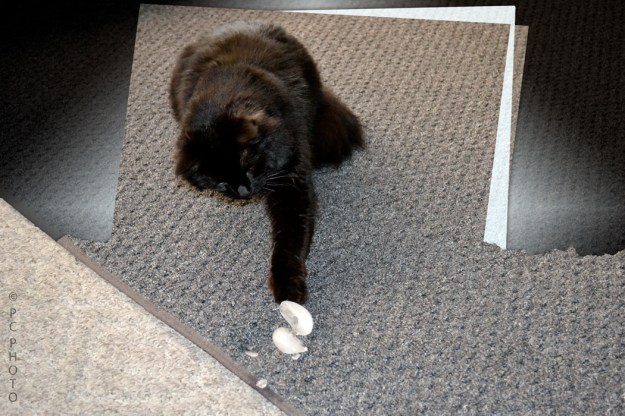 This photo shows Jack the cat couldn’t resist the opportunity to investigate ice cubes placed on a carpet to raise the fibers where a heavy piece of furniture had made an indentation. His tentative reach is saying WHAT IS THAT???