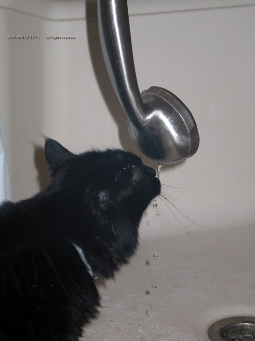 Our cats prefer the bathtub . We run the shower briefly so the water collects near the drain. really like how you caught the water in motion.