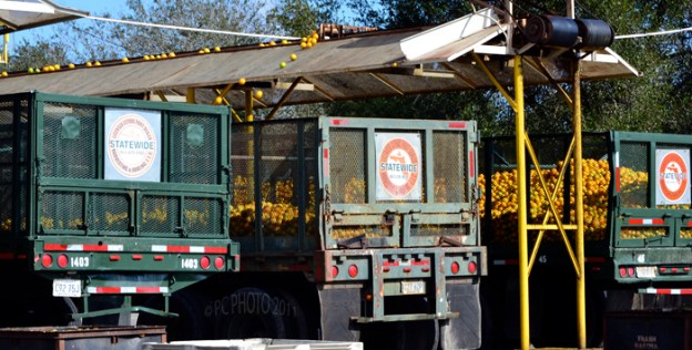 The orange groves are providing a GENEROUS harvest this year. This is one of those lucky opportunities that presented while driving past a citrus distribution plant. The oranges are washed and sorted in a warehouse then they ride an overhead conveyor belt outdoors where they drop into trucks that will deliver them to orange juice processing plants.